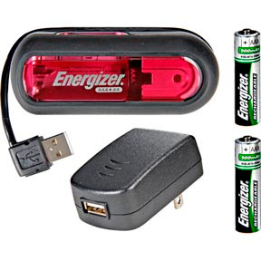 The Energizer DUO Charger lets you power up (two at a time) AA or AAA NiMh batteries by plugging it either in a wall outlet or in the USB port of a computer. The charging time varies between 2 and 4 hours depending on battery type. It's small and light...so it's a good traveler. It ships with two Energizer AAA batteries and costs anywhere between $12-15. The downside of this charger is that it only charges two batteries at a time.